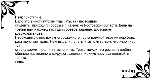 Итак приступим. Бвло это в институтские годы. Мы, как настоящие студенты, проходили сборы в г. Каменске Ростовской области. День на третий нам наконец таки дали боевое задание, достойное красноармейцев. Необходимо было вокруг огороженного парка военной техники порубать, растущую там траву. Нам выдали лопаты и мы с чувством, что незря нас тут страна кормит пошли ее выполнять. Трава между тем росла из щебня, обильно насыпанного вокруг ограздения. Махнув пару раз лопатой, и только лишь примяв траву, мы уселись перекурить, и так получилось, около сторожевой вышки. Курим сидим, проводим интелектуальные беседы о преимуществах службы в красной армии, вдруг из вышки слышим голос: "Пацаны есть курить?". Мыребята не жадные: "Есть" - говорим - "Выходи". Открывется дверка из нее выглядывает солдат, при чем росточку ну метр 50 максимум. Каска ему почти по нос, бронежилет по колено. Зырит так с опаской по сторонам - не дай бог отцы-коммандиры засекут - чистить ему не только картошку придется. Оставляет на вышке автомат и начинает к нам спусткаться держась руками за перила. Тут до него доходит, что быстро он с задачей этой не справится, и он на локтях становится на перила, поджимает ноги и спускается. По той скорости, котору он развил стало понятно что перегрузки имели место. В момент когда он выпрямил ноги для соприкосновения с землей, скорость была уже велика. Каска перевесила его и он по инерции сильно таки шандарахнулся головой об землю, да так что каска укатилась меторов на 5. Не зря наших бойцов обучают военному делу и развивают выносливость и всякое такое, чтобы в экстренных ситуциях не теряться, и продолжать выполнять поставленную задачу. Он вскакивает на ноги (я бы наверное минут 5 не понимал куда вообще мне идити, и что я тут делаю. Но я ведь всего то студент и меня не учили этому), бежит поднимает каску, мгновенно выхватывает сигареты у нас из рук и наверное наверх залетает еще с большей скоростью. Все это заняло секунд 5 наверное. Мы ржали наверное на всю часть. Не легка все таки служба))
