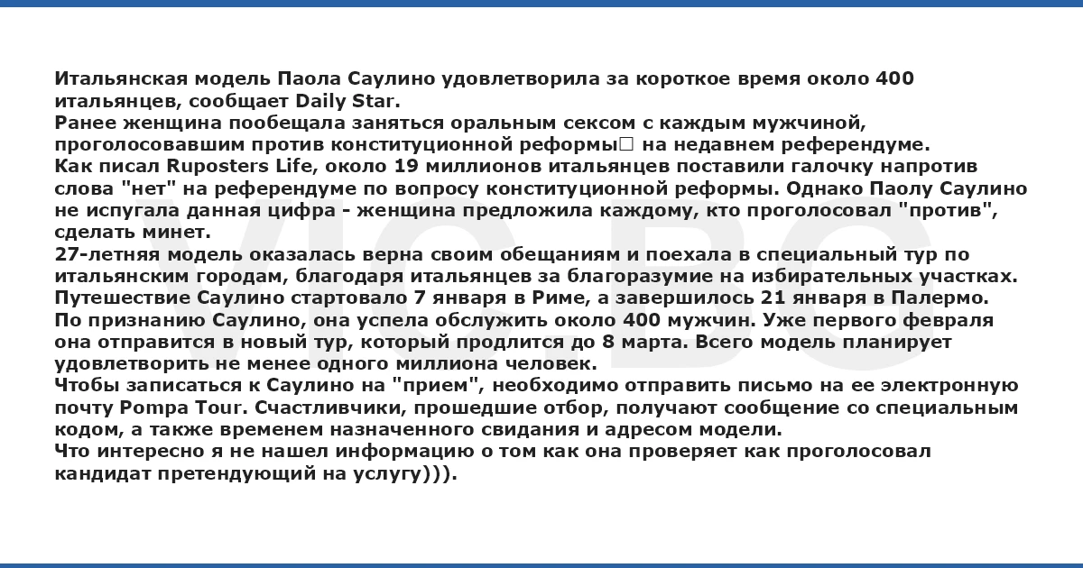 Итальянская модель Паола Саулино удовлетворила за короткое время около 400 итальянцев, сообщает Daily Star. Ранее женщина пообещала заняться оральным сексом с каждым мужчиной, проголосовавшим против конституционной реформы на недавнем референдуме. Как писал Ruposters Life, около 19 миллионов итальянцев поставили галочку напротив слова "нет" на референдуме по вопросу конституционной реформы. Однако Паолу Саулино не испугала данная цифра - женщина предложила каждому, кто проголосовал "против", сделать mинet. 27-летняя модель оказалась верна своим обещаниям и поехала в специальный тур по итальянским городам, благодаря итальянцев за благоразумие на избирательных участках. Путешествие Саулино стартовало 7 января в Риме, а завершилось 21 января в Палермо. По признанию Саулино, она успела обслужить около 400 мужчин. Уже первого февраля она отправится в новый тур, который продлится до 8 марта. Всего модель планирует удовлетворить не менее одного миллиона человек. Чтобы записаться к Саулино на "прием", необходимо отправить письмо на ее электронную почту Ромра Tour. Счастливчики, прошедшие отбор, получают сообщение со специальным кодом, а также временем назначенного свидания и адресом модели. Что интересно я не нашел информацию о том как она проверяет как проголосовал кандидат претендующий на услугу))).