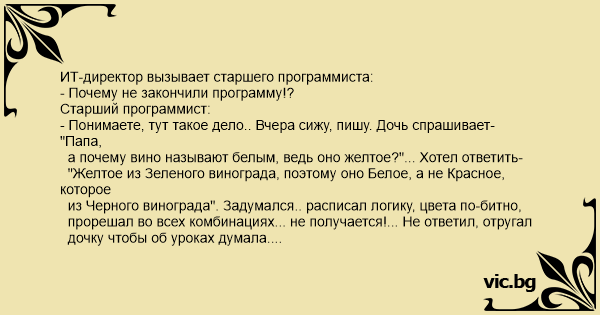 ИТ-директор вызывает старшего программиста: - Почему не закончили программу!? Старший программист: - Понимаете, тут такое дело.. Вчера сижу, пишу. Дочь спрашивает- "Папа, а почему вино называют белым, ведь оно желтое?"... Хотел ответить- "Желтое из Зеленого винограда, поэтому оно Белое, а не Красное, которое из Черного винограда". Задумался.. расписал логику, цвета по-битно, прорешал во всех комбинациях... не получается!... Не ответил, отругал дочку чтобы об уроках думала. сам расстроился, бросил программу, весь вечер сидел и ненавидел человеческий фактор... ИТ-директор: - Хахаха! Вот не зря про вас, кодеров, говорят что вы "не от мира сего"! Ну какие "цвета по-битно" в отрицательные годы? Тут длины волн брать нужно..