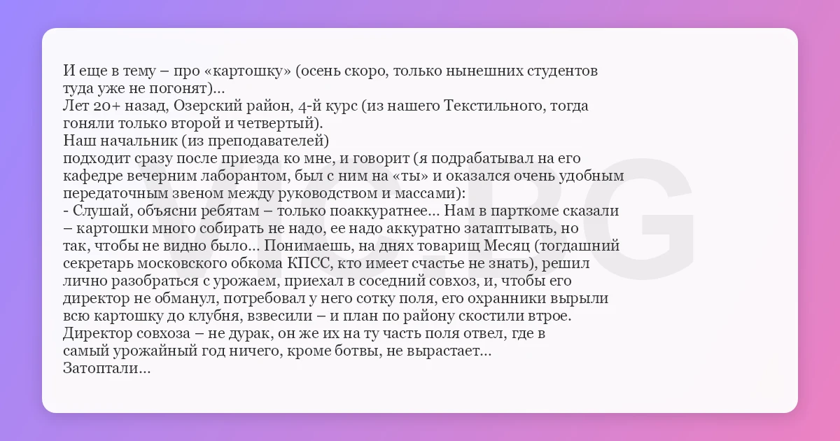 И еще в тему – про «картошку» (осень скоро, только нынешних студентов туда уже не погонят)… Лет 20+ назад, Озерский район, 4-й курс (из нашего Текстильного, тогда гоняли только второй и четвертый). Наш начальник (из преподавателей) подходит сразу после приезда ко мне, и говорит (я подрабатывал на его кафедре вечерним лаборантом, был с ним на «ты» и оказался очень удобным передаточным звеном между руководством и массами): - Слушай, объясни ребятам – только поаккуратнее… Нам в парткоме сказали – картошки много собирать не надо, ее надо аккуратно затаптывать, но так, чтобы не видно было… Понимаешь, на днях товарищ Месяц (тогдашний секретарь московского обкома КПСС, кто имеет счастье не знать), решил лично разобраться с урожаем, приехал в соседний совхоз, и, чтобы его директор не обманул, потребовал у него сотку поля, его охранники вырыли всю картошку до клубня, взвесили – и план по району скостили втрое. Директор совхоза – не дуpak, он же их на ту часть поля отвел, где в самый урожайный год ничего, кроме ботвы, не вырастает… Затоптали…