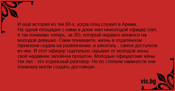 На одной площадке с нами в доме жил немолодой офицер (лет, я так понимаю теперь, за 30), который недавно женился на молодой девушке. Сами понимаете, жизнь в отдалённом гарнизоне скудна на развлечения, а алкоголь - самое доступное из них. И этот офицер тщательно скрывал от молодой жены своё недавнее запойное прошлое. Молодые офицерские жёны тех лет - это отдельный разговор. Но по степени наивности они поначалу могли создать достойную конкуренцию нынешним блондинкам. Вот и наш офицер сумел внушить своей половинке, что он опасно болен (чуть ли не облучение по службе), и врачи прописали ему в качестве лекарства ежедневно по 20 капель кипячёной воды на стакан спирта. И она кипятила и капала, пока соседки не открыли ей глаза и не объяснили, что он обыкновенный алкаш.