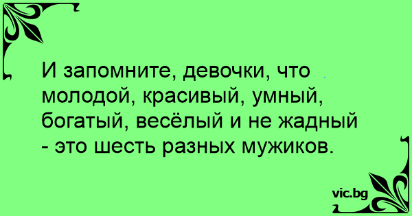 И запомните, девочки, что молодой, красивый, умный, богатый, весёлый и не жадный - это шесть разных мужиков.