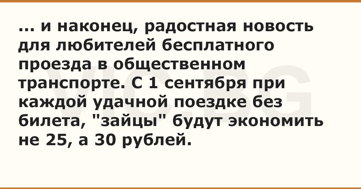... и наконец, радостная новость для любителей бесплатного проезда в общественном транспорте. С 1 сентября при каждой удачной поездке без билета, "зайцы" будут экономить не 25, а 30 рублей.