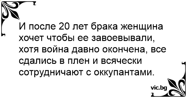 И после 20 лет брака женщина хочет чтобы ее завоевывали, хотя война давно окончена, все сдались в плен и всячески сотрудничают с оккупантами.