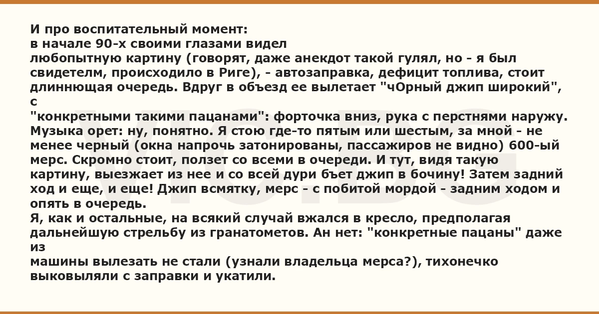 длиннющая очередь. Вдруг в объезд ее вылетает "чОрный джип широкий", с