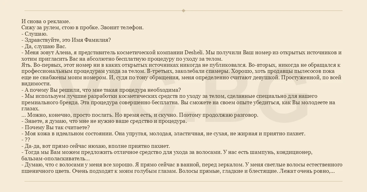 И снова о рекламе. Сижу за рулем, стою в пробке. Звонит телефон. - Слушаю. - Здравствуйте, это Имя Фамилия? - Да, слушаю Вас. - Меня зовут Алена, я представитель косметической компании Desheli. Мы получили Ваш номер из открытых источников и хотим пригласить Вас на абсолютно бесплатную процедуру по уходу за телом. Ять. Во-первых, этот номер ни в каких открытых источниках никогда не публиковался. Во-вторых, никогда не обращался к профессиональным процедурам ухода за телом. В-третьих, заколебали спамеры. Хорошо, хоть продавцы пылесосов пока еще не снабжены моим номером. И, судя по тону обращения, меня определенно считают девушкой. Простуженной, по всей видимости. - А почему Вы решили, что мне такая процедура необходима? - Мы используем лучшие разработки косметических средств по уходу за телом, сделанные специально для нашего премиального бренда. Эта процедура совершенно бесплатна. Вы сможете на своем опыте убедиться, как Вы молодеете на глазах. … Можно, конечно, просто послать. Но время есть, и скучно. Поэтому продолжаю разговор. - Знаете, я думаю, что мне не нужно ваше средство и процедура. - Почему Вы так считаете? - Моя кожа в идеальном состоянии. Она упругая, молодая, эластичная, не сухая, не жирная и приятно пахнет. - ?? - Да-да, вот прямо сейчас нюхаю, вполне приятно пахнет. - Тогда мы Вам можем предложить отличное средство для ухода за волосами. У нас есть шампунь, кондиционер, бальзам-ополаскиватель… - Думаю, что с волосами у меня все хорошо. Я прямо сейчас в ванной, перед зеркалом. У меня светлые волосы естественного пшеничного цвета. Очень подходят к моим голубым глазам. Волосы прямые, гладкие и блестящие. Лежат очень ровно, таким вот блестящим каскадом на плечах. Немного вьются на концах. Да, определенно, я само совершенство. - Но вы же пользуетесь шампунем? - Нет, я мою волосы отваром ромашки и крапивы. Очень полезно. И вопль отчаяния: - Мы можем Вам предложить средства для вывода токсинов и уникальный ультразвуковой аппарат для мягкого деликатного массажа тканей. - Каких тканей? - Мягких. - Девушка, я понимаю, что массировать твердые ткани, кости, глупо. Какие ткани Вы предлагаете мне массажировать вашим аппаратом? - Любые, в любых проблемных зонах. - Девушка, у меня нет проблемных зон. У меня кожа светло-оливкового цвета, хороший загар. С фигурой тоже нет проблем. Рост 170, вес 51. Что мне массажировать? Только продуло где-то. У Вас есть бесплатные леденцы от кашля? - Нету, извините. Кладет трубку. Теперь, наверное, напротив моей фамилии стоит пометка «дура». А вот не надо клиентские базы воровать!