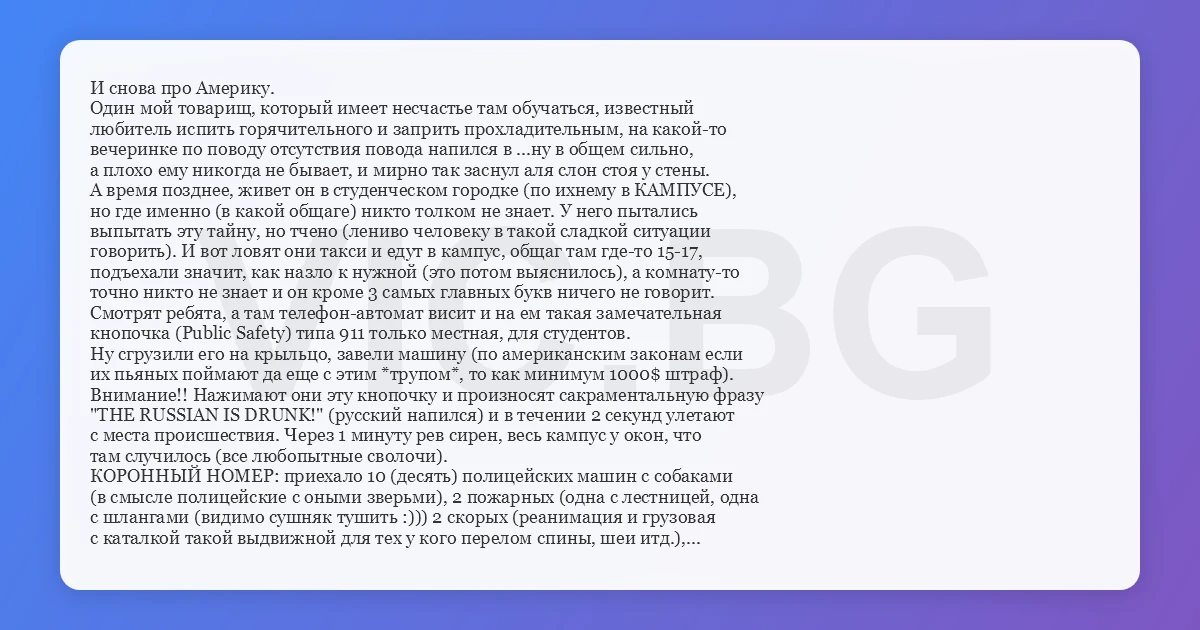 И снова про Америку. Один мой товарищ, который имеет несчастье там обучаться, известный любитель испить горячительного и заприть прохладительным, на какой-то вечеринке по поводу отсутствия повода напился в ...ну в общем сильно, а плохо ему никогда не бывает, и мирно так заснул аля слон стоя у стены. А время позднее, живет он в студенческом городке (по ихнему в КАМПУСЕ), но где именно (в какой общаге) никто толком не знает. У него пытались выпытать эту тайну, но тчено (лениво человеку в такой сладкой ситуации говорить). И вот ловят они такси и едут в кампус, общаг там где-то 15-17, подъехали значит, как назло к нужной (это потом выяснилось), а комнату-то точно никто не знает и он кроме 3 самых главных букв ничего не говорит. Смотрят ребята, а там телефон-автомат висит и на ем такая замечательная кнопочка (Public Safety) типа 911 только местная, для студентов. Ну сгрузили его на крыльцо, завели машину (по американским законам если их пьяных поймают да еще с этим *трупом*, то как минимум 1000$ штраф). Внимание!! Нажимают они эту кнопочку и произносят сакраментальную фразу "THE RUSSIAN IS DRUNК!" (русский напился) и в течении 2 секунд улетают с места происшествия. Через 1 минуту рев сирен, весь кампус у окон, что там случилось (все любопытные сволочи). КОРОННЫЙ НОМЕР: приехало 10 (десять) полицейских машин с собаками (в смысле полицейские с оными зверьми), 2 пожарных (одна с лестницей, одна с шлангами (видимо сушняк тушить :))) 2 скорых (реанимация и грузовая с каталкой такой выдвижной для тех у кого перелом спины, шеи итд.), а он живет на втором этаже (10 ступенек пройти от силы). И вот с таким арсеналом этот спецназ начал у него выяснять где он живет. А друг мой только три буквы помнит и те не по ихнему, в общем проснулся он на следующий день у себя в комнате, но это не конец. В кармане он обнаружил квитанции, цитирую: за вызов пожарных (кто их звал? Они сами приехали.), За мед.освидетельствование (в округе все цветы от перегара завяли, а они еще и проверяют - вдруг это у него туалетная вода такая), ну штраф в полицию это ладно прощаю, но штраф за (дословно) ОСКВЕРНЕНИЕ ЛЕСТНИЦЫ КОЛЛЕДЖА, до сих пор остается загадкой. Вот так вот пейте дети молоко будете здоровы! ВСі!