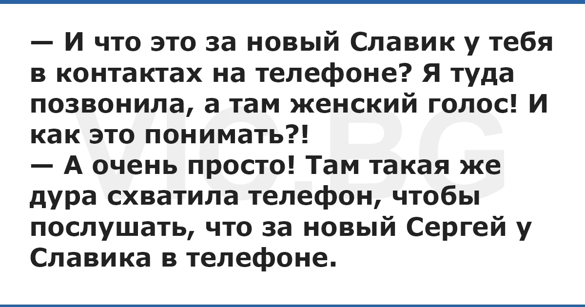 — А очень просто! Там такая же дура схватила телефон, чтобы послушать, что за новый Сергей у Славика в телефоне.
