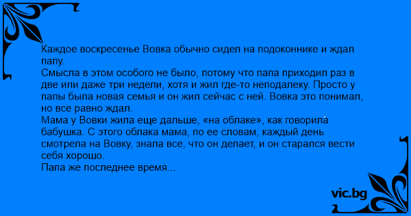 Смысла в этом особого не было, потому что папа приходил раз в две или даже три недели, хотя и жил где-то неподалеку. Просто у папы была новая семья и он жил сейчас с ней. Вовка это понимал, но все равно ждал.