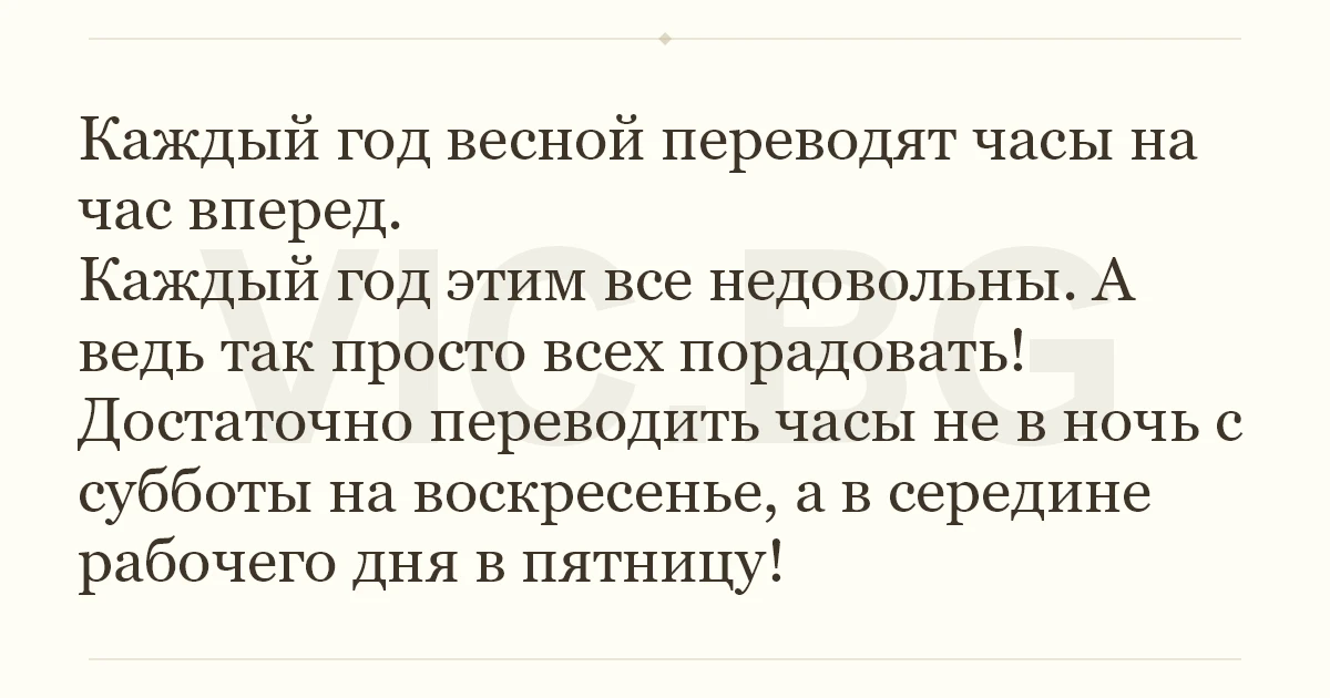 Каждый год весной переводят часы на час вперед. Каждый год этим все недовольны. А ведь так просто всех порадовать! Достаточно переводить часы не в ночь с субботы на воскресенье, а в середине рабочего дня в пятницу!