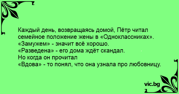 Каждый день, возвращаясь домой, Пётр читал семейное положение жены в «Одноклассниках».