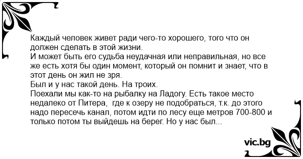 Каждый человек живет ради чего-то хорошего, того что он должен сделать в этой жизни. И может быть его судьба неудачная или неправильная, но все же есть хотя бы один момент, который он помнит и знает, что в этот день он жил не зря. Был и у нас такой день. На троих. Поехали мы как-то на рыбалку на Ладогу. Есть такое место недалеко от Питера, где к озеру не подобраться, т.к. до этого надо пересечь канал, потом идти по лесу еще метров 700-800 и только потом ты выйдешь на берег. Но у нас был знакомый, который жил на этой ничейной земле, перевозя через канал, сдавая лодки и ночлег в заброшенном здании. Вот мы туда и прибыли. Разместились и пошли на вечернюю зорьку. Только вышли из зарослей тростника, как сын говорит, мол смотрите лодка переворачивается. Ветра нет, а вдалеке видно, как резинку переворачивает. Стало понятно, что кто-то выпал и пытается забраться обратно. Рванули туда, доплыли. Рыбак, пенсионного возраста, уже просто висел обессиленый на веревке вдоль борта и был белый как полотно. Затащили. Подхватили лодку и назад. Я не стану останавливаться на том, как мы его отпаивали коньяком, тащили лодку с опущенными якорем и затаскивали мужчину в дом. В общем, он выжил и это самое главное. Как оказалось, мужчина был сердечник и его в какой-то момент качнуло. Он выпал и потом в течение 3 часов пытался забраться на лодку. До берега далеко, вода +12 и место, где никого не бывает. Одним словом, повезло ему в этот раз. Его ангел прислал нас в самый последний момент. Зато теперь я знаю, что не зря прожил хотя бы один день. И безмерно благодарен небесам за предоставленную возможность - помочь ближнему.