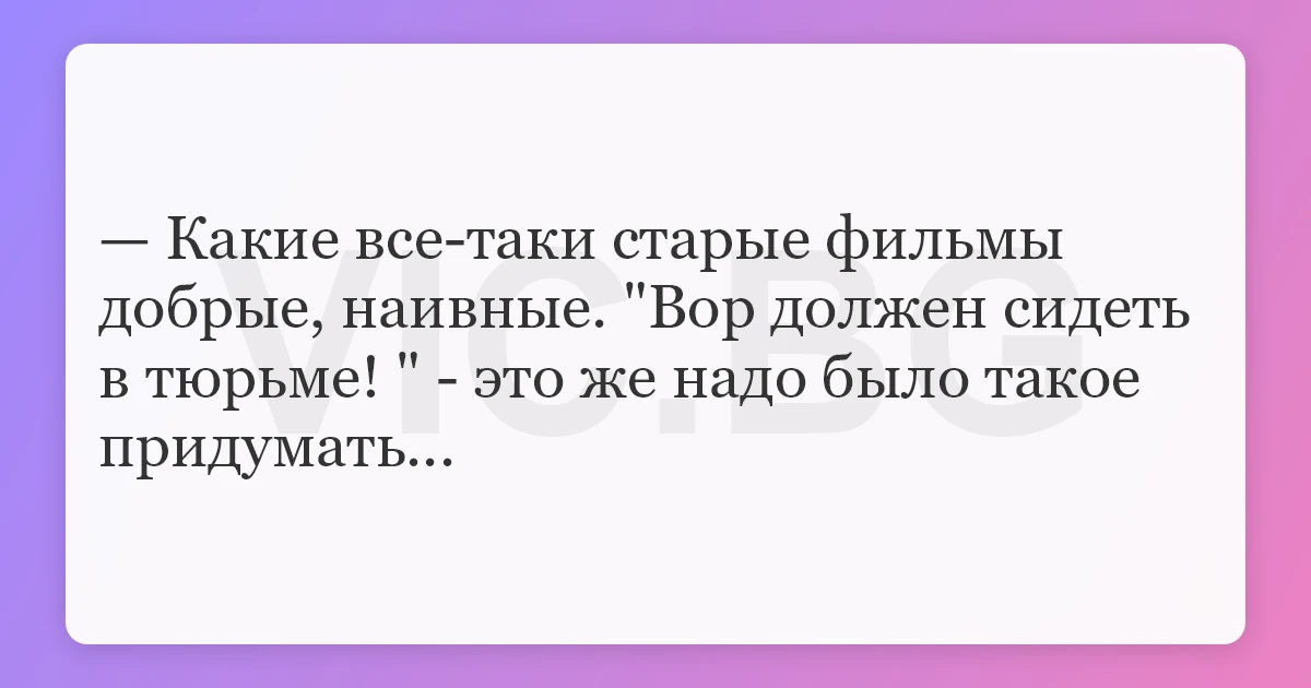 — Какие все-таки старые фильмы добрые, наивные. "Вор должен сидеть в тюрьме! " - это же надо было такое придумать...