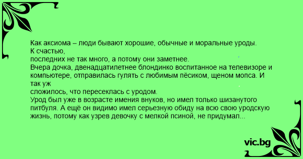 Как аксиома – люди бывают хорошие, обычные и моральные уроды. К счастью, последних не так много, а потому они заметнее. Вчера дочка, двенадцатилетнее блондинко воспитанное на телевизоре и компьютере, отправилась гулять с любимым пёсиком, щеном мопса. И так уж сложилось, что пересеклась с уродом. Урод был уже в возрасте имения внуков, но имел только шизанутого питбуля. А ещё он видимо имел серьезную обиду на всю свою уродскую жизнь, потому как узрев девочку с мелкой псиной, не придумал лучшего способа мести. Да, да. Натравил. Ммм… что сказать… после того, что было ПОТОМ, я так думаю, на жизнь он обиделся ещё больше. Потому как «двенадцатилетнее блондинко воспитанное на телевизоре» моментально просекло потенциальную опасность и… …подхватив любимца подмышку… …моментально оказавшись позади урода… … цапнула его одной рукой за капюшон, а другой за брючный ремень. И принялась прикрываться уродом как щитом от его же бешеной собаки!!! Тупая псина ОБОЙТИ к нашему счастью не догадалась, а попыталась ПРОГРЫЗТЬСЯ. В смысле сквозь хозяина. Дочка под эту марку оперативно катапультировалась. И, что характерно, дома о происшествии молчала как партизан. Соседи просветили. На вопрос – почему сразу не сказала, ответила. Ответ меня убил. - Ну во-первых, опять начнете говорить, что от Арчика все проблемы, во-вторых, этот крокодил своими зубищами мне вот только руку немножко ушиб, а в третьих – вы бы видели этого задрота. В СУД НА ТАКОГО ПОДАВАТЬ – СМЫСЛА НЕТ!!!