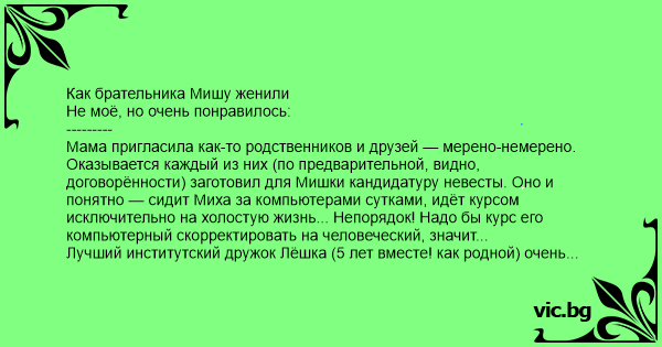 Как брательника Мишу женили Не моё, но очень понравилось: