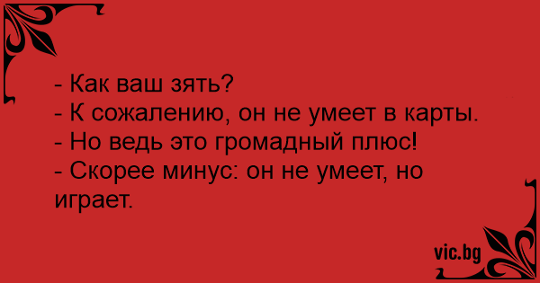 - Как е зет ти? - За съжаление не може да играе на карти. - Че това е плюс - По-скоро минус. Не може, но играе