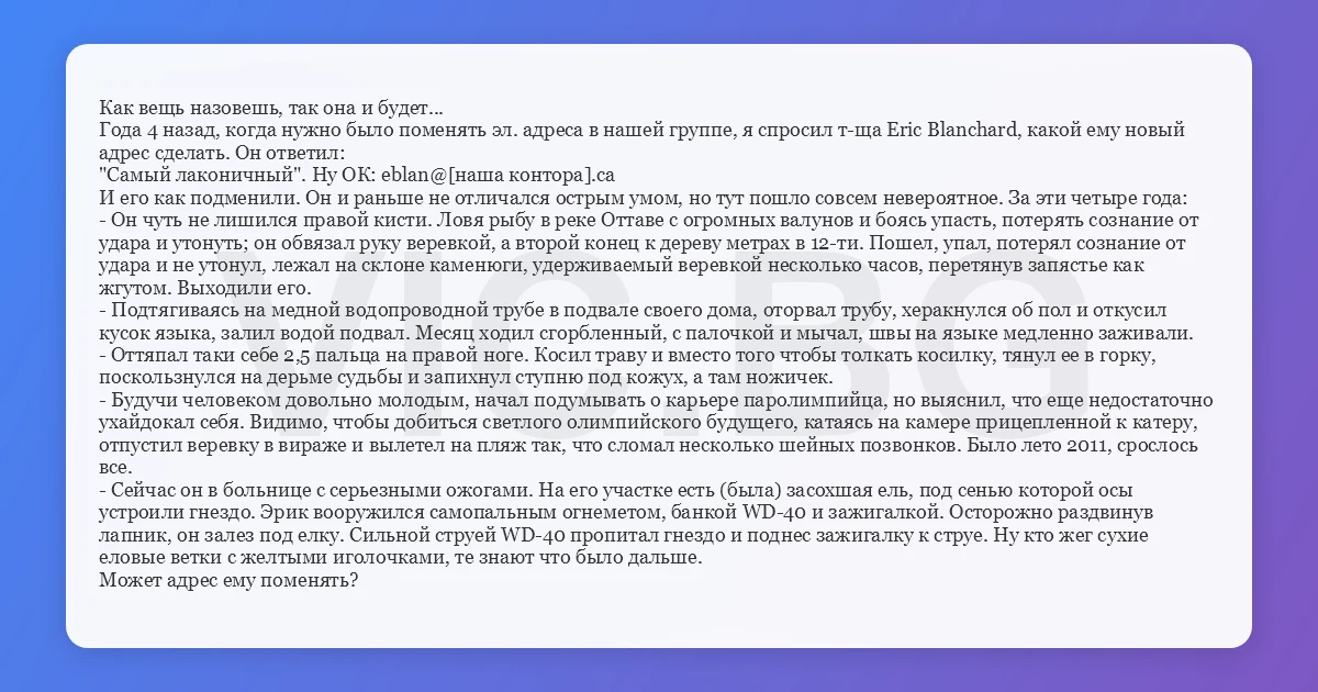 Года 4 назад, когда нужно было поменять эл. адреса в нашей группе, я спросил т-ща Eric Blanchard, какой ему новый адрес сделать. Он ответил: