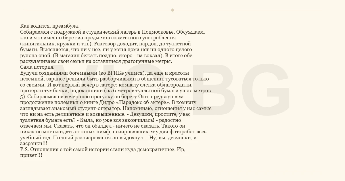 Как водится, преамбула. Собираемся с подружкой в студенческий лагерь в Подмосковье. Обсуждаем, кто и что именно берет из предметов совместного употребления (кипятильник, кружки и т.п.). Разговор доходит, пардон, до туалетной бумаги. Выясняется, что ни у нее, ни у меня дома нет ни одного целого рулона оной. (В магазин бежать поздно, скоро - на вокзал). В итоге обе раскулачиваем свои семьи на оставшиеся драгоценные метры. Сама история. Будучи созданиями богемными (во ВГИКе учимся), да еще и красоты неземной, заранее решили быть разборчивыми в общении, тусоваться только со своими. И вот первый вечер в лагере: комнату слегка облагородили, протерли тумбочки, подоконники (из 6 метров туалетной бумаги ушло метров 5). Собираемся на вечернюю прогулку по берегу Оки, предвкушаем продолжение полемики о книге Дидро «Парадокс об актере». В комнату заглядывает знакомый студент-оператор. Напоминаю, отношения у нас самые что ни на есть деликатные и возвышенные. - Девушки, простите, у вас туалетная бумага есть? - Была, но уже вся закончилась! - радостно отвечаем мы. Сказать, что он обалдел - ничего не сказать. Такого он никак не мог ожидать от юных нимф, позировавших ему для фоторабот весь учебный год. Полный разочарования он выдохнул: - Ну, вы, девчонки, и засранки!!! P.S. Отношения с той самой истории стали куда демократичнее. Ир, привет!!!