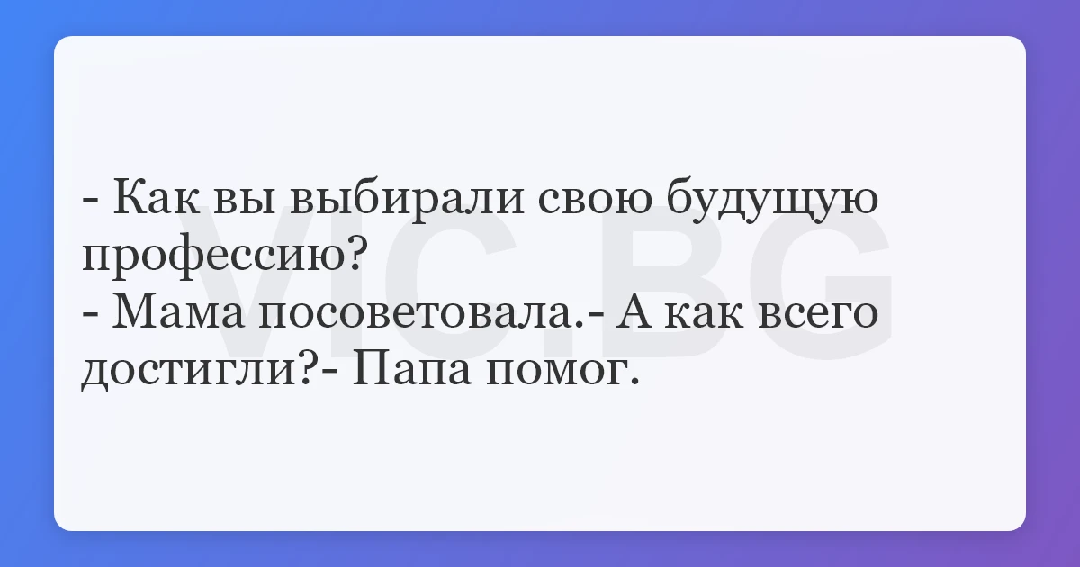 - Как вы выбирали свою будущую профессию? - Мама посоветовала.- А как всего достигли?- Папа помог.