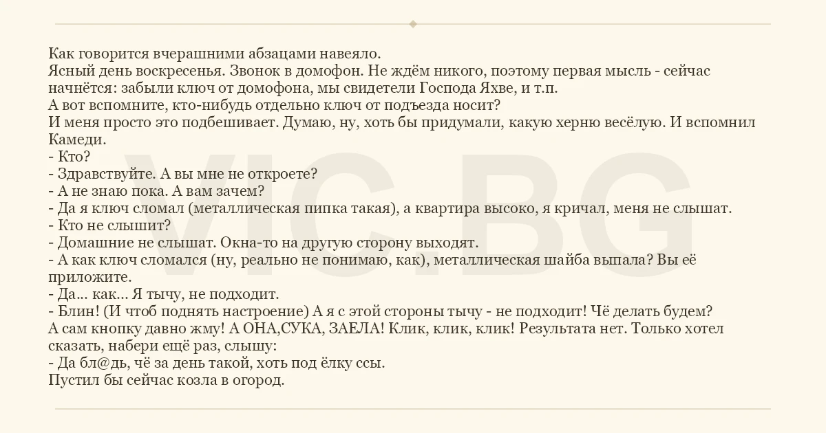 Ясный день воскресенья. Звонок в домофон. Не ждём никого, поэтому первая мысль - сейчас начнётся: забыли ключ от домофона, мы свидетели Господа Яхве, и т.п.