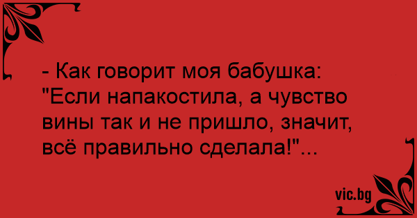- Как говорит моя бабушка: "Если напакостила, а чувство вины так и не пришло, значит, всё правильно сделала!"...