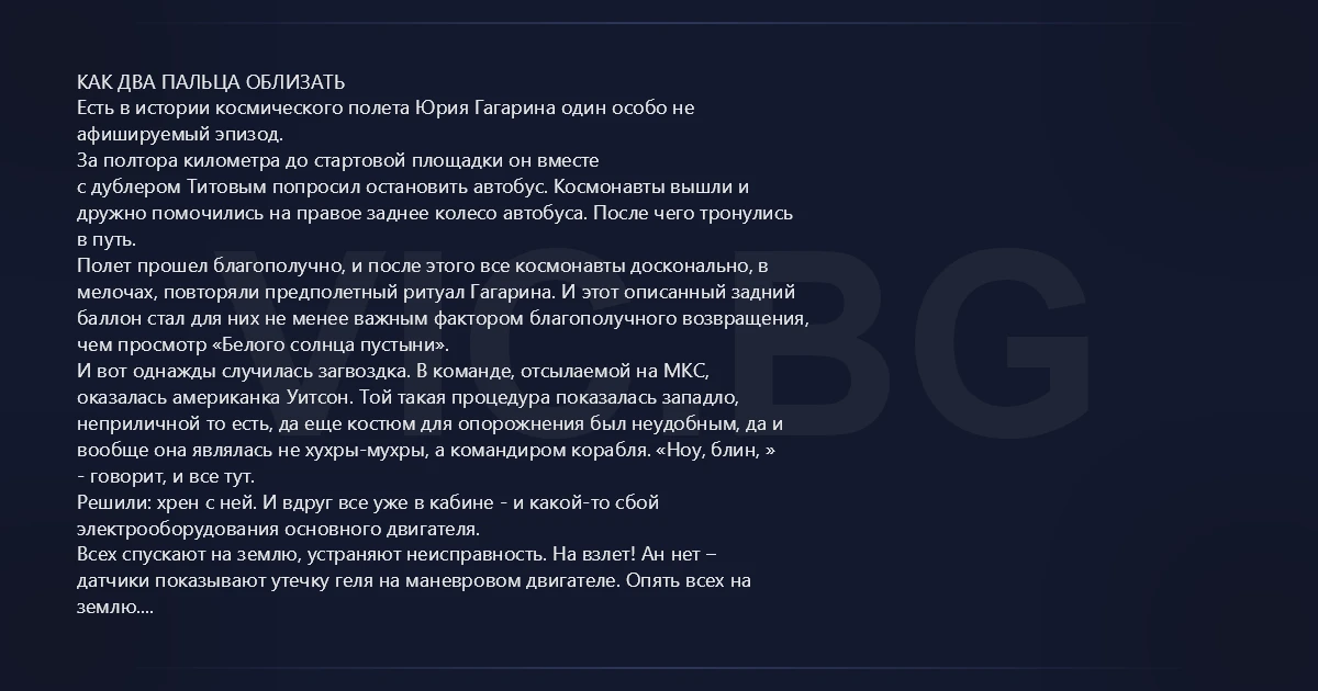 КАК ДВА ПАЛЬЦА ОБЛИЗАТЬ Есть в истории космического полета Юрия Гагарина один особо не афишируемый эпизод. За полтора километра до стартовой площадки он вместе с дублером Титовым попросил остановить автобус. Космонавты вышли и дружно помочились на правое заднее колесо автобуса. После чего тронулись в путь. Полет прошел благополучно, и после этого все космонавты досконально, в мелочах, повторяли предполетный ритуал Гагарина. И этот описанный задний баллон стал для них не менее важным фактором благополучного возвращения, чем просмотр «Белого солнца пустыни». И вот однажды случилась загвоздка. В команде, отсылаемой на МКС, оказалась американка Уитсон. Той такая процедура показалась западло, неприличной то есть, да еще костюм для опорожнения был неудобным, да и вообще она являлась не хухры-мухры, а командиром корабля. «Ноу, блин, » - говорит, и все тут. Решили: хpeн с ней. И вдруг все уже в кабине - и какой-то сбой электрооборудования основного двигателя. Всех спускают на землю, устраняют неисправность. На взлет! Ан нет – датчики показывают утечку геля на маневровом двигателе. Опять всех на землю. И тут кто-то не выдержал и наябедничал командиру полетов о поступке американки. По его приказу Уитсон немедленно запихивают в автобус, отвозят на полтора километра и заставляют самым активным образом орошать автопокрышку. Космическая экспедиция справилась с заданием блестяще.