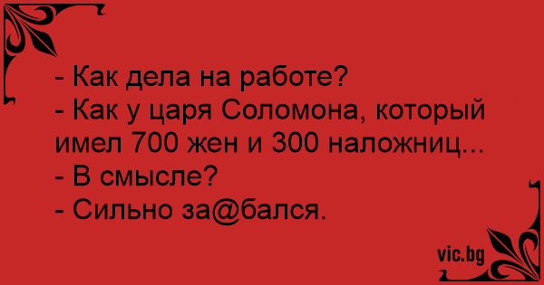 - Как дела на работе? - Как у царя Соломона, который имел 700 жен и 300 наложниц... - В смысле? - Сильно за@бался.
