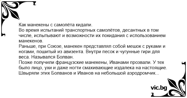 Как манекены с самолёта кидали. Во время испытаний транспортных самолётов, десантных в том числе, испытывают и возможности их покидания с использованием манекенов. Раньше, при Союзе, манекен представлял собой мешок с руками и ногами, пошитый из авизента. Внутри песок и чугунные гири для веса. Назывался Болван. Позже получили французские манекены, Иванами прозвали. У тех было лицо, ухи и даже ногти смахивающие издалека на настоящие. Швыряли этих Болванов и Иванов на небольшой аэродромчик под Бородянкой, которым владели совместно с аэроклубом. В одном из выбросов что-то пошло не так, и парашют с Иваном занесло в село гораздо дальше Бородянки. Гэпнулся он на крышу склада, который охранял дед с карамультуком. Что увидел сторож? Что с неба об его склад на€бн¥£$я чувак с парашютом, и сейчас лежит мордой в землю, не подавая признаков жизни. Дед смог вызвать начальника, правда к телу его не подпустил, нельзя до приезда органов, наследишь! Ну, начальник то в курсах, позвонил к нам на ЛИиДБ, мол ваше тут? Парашютчики на Газоне приехали довольно быстро и просекли ситуацию с юмором. На глазах у любопытных за забором подошли к телу, один из них зарядил сапогом в голову "лётчику". Не шевелится, значит всё! Выкурили по сигаретке, отстегнули парашют и за ноги-руки на раз-два-три забросили в кузов. В общем, в окрестных сёлах сложилось мнение, подтверждённое дюжиной очевидцев, что на фирме Антонов лётчики - материал расходный и особой ценности не представляют.