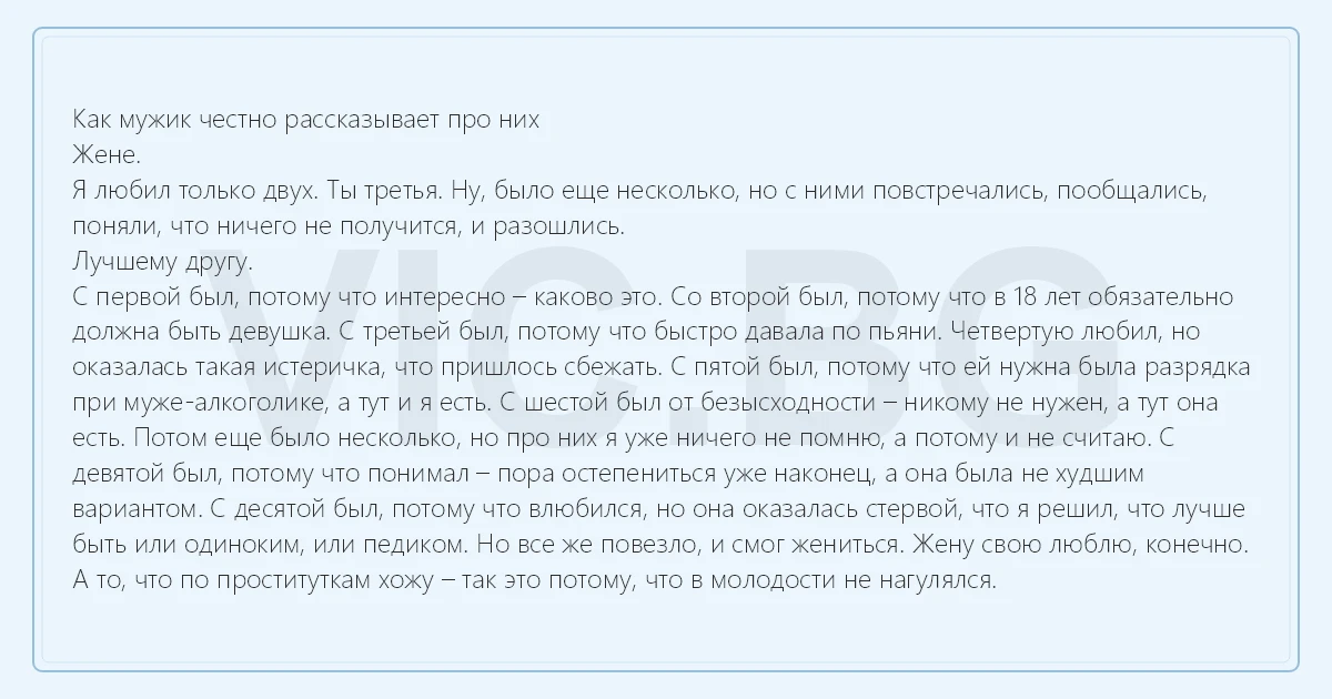 С первой был, потому что интересно – каково это. Со второй был, потому что в 18 лет обязательно должна быть девушка. С третьей был, потому что быстро давала по пьяни. Четвертую любил, но оказалась такая истеричка, что пришлось сбежать. С пятой был, потому что ей нужна была разрядка при муже-алкоголике, а тут и я есть. С шестой был от безысходности – никому не нужен, а тут она есть. Потом еще было несколько, но про них я уже ничего не помню, а потому и не считаю. С девятой был, потому что понимал – пора остепениться уже наконец, а она была не худшим вариантом. С десятой был, потому что влюбился, но она оказалась стервой, что я решил, что лучше быть или одиноким, или педиком. Но все же повезло, и смог жениться. Жену свою люблю, конечно. А то, что по проституткам хожу – так это потому, что в молодости не нагулялся.