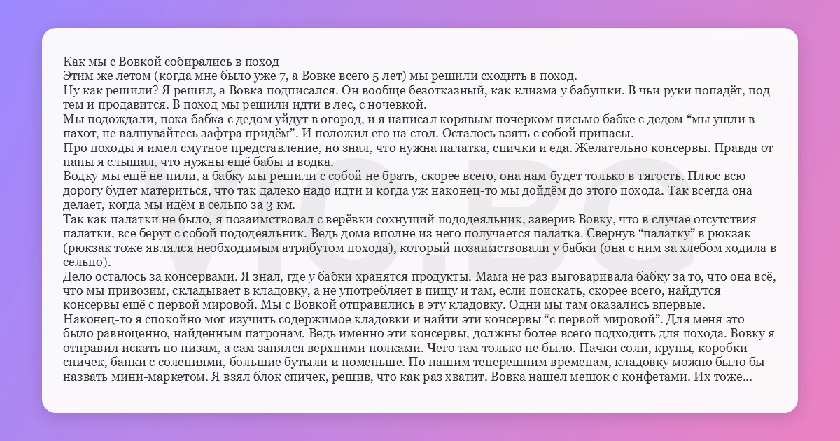 Как мы с Вовкой собирались в поход Этим же летом (когда мне было уже 7, а Вовке всего 5 лет) мы решили сходить в поход. Ну как решили? Я решил, а Вовка подписался. Он вообще безотказный, как клизма у бабушки. В чьи руки попадёт, под тем и продавится. В поход мы решили идти в лес, с ночевкой. Мы подождали, пока бабка с дедом уйдут в огород, и я написал корявым почерком письмо бабке с дедом “мы ушли в пахот, не валнувайтесь зафтра придём”. И положил его на стол. Осталось взять с собой припасы. Про походы я имел смутное представление, но знал, что нужна палатка, спички и еда. Желательно консервы. Правда от папы я слышал, что нужны ещё бабы и водка. Водку мы ещё не пили, а бабку мы решили с собой не брать, скорее всего, она нам будет только в тягость. Плюс всю дорогу будет материться, что так далеко надо идти и когда уж наконец-то мы дойдём до этого похода. Так всегда она делает, когда мы идём в сельпо за 3 км. Так как палатки не было, я позаимствовал с верёвки сохнущий пододеяльник, заверив Вовку, что в случае отсутствия палатки, все берут с собой пододеяльник. Ведь дома вполне из него получается палатка. Свернув “палатку” в рюкзак (рюкзак тоже являлся необходимым атрибутом похода), который позаимствовали у бабки (она с ним за хлебом ходила в сельпо). Дело осталось за консервами. Я знал, где у бабки хранятся продукты. Мама не раз выговаривала бабку за то, что она всё, что мы привозим, складывает в кладовку, а не употребляет в пищу и там, если поискать, скорее всего, найдутся консервы ещё с первой мировой. Мы с Вовкой отправились в эту кладовку. Одни мы там оказались впервые. Наконец-то я спокойно мог изучить содержимое кладовки и найти эти консервы “с первой мировой”. Для меня это было равноценно, найденным патронам. Ведь именно эти консервы, должны более всего подходить для похода. Вовку я отправил искать по низам, а сам занялся верхними полками. Чего там только не было. Пачки соли, крупы, коробки спичек, банки с солениями, большие бутыли и поменьше. По нашим теперешним временам, кладовку можно было бы назвать мини-маркетом. Я взял блок спичек, решив, что как раз хватит. Вовка нашел мешок с конфетами. Их тоже решили взять с собой, да побольше. Ведь если рассудить здравомысляще, то конфеты поважнее консервов. Ведь без консервов мы вполне обходимся, а без конфет совсем хренова. Но консервы надо было найти, иначе поход не получится. Помимо полок и мешков, вдоль стены тянулись два больших ящика. Высотой мне по грудь. Видимо там самое ценное, решили мы и попытались открыть один из них. Крышка была тяжелая, что указывало на ценность содержимого. Значит, открыть надо было в любом случае. Мы с Вовкой изо всех сил поднажали, но крышка открылась буквально на 10-15 сантиметров. - Непреодолимые трудности, - многозначительно сказал я. - Беги во двор, и принеси брусков разной длинны. Дед чё-то во дворе мастерил и в большой куче пиломатериалов, валялось куча строительных отходов. - Какой длины? - переспросил Вовка. - Разных, - уточнил я. Больших и маленьких. Штуки три-четыре. У меня есть идея. Вовка метнулся и принёс четыре бруска. - Значит так, мы сейчас поднимаем насколько сможем, затем я кричу - давай! Ты хватаешь вот этот брусок и суёшь в щель, пока я держу крышку. - объяснял я Вовке план. На счёт три, мы опять подняли крышку. Я крикнул - Давай! И напрягся как штангист и даже пёрнул. Вовка оказался про