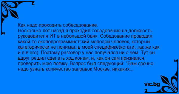 Несколько лет назад я проходил собедование на должность руководителя ИТ в небольшой банк. Собедование проводил какой-то околопрограммистский молодой человек, который категорически не понимал в моей специфике(кстати, так же как и я в его). Поэтому разговор у нас получался ни о чем. Тут он вдруг решил сделать ход конем, и, как он сам признался, проверить мою логику. Вопрос был следующий: "Вам срочно надо узнать количество заправок Москве, никаких информационных полей типа интернета у вас нет". Дальше был мой экспромт - я наморщил лоб и несколько секунд делал вид, что что-то пытаюсь вспомнить. Потом с видимым облегчением выдохнул:"Вспомнил! 1241". парень крайне удивился, но я спокойно стал рассказывать, что читал какой-то нудный журнал и там говорилось о количестве заправок и приводились цифры на начало года и пр...