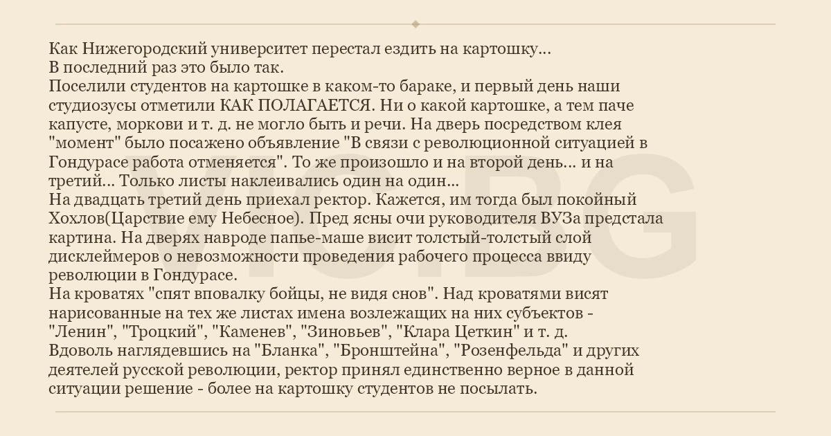 Как Нижегородский университет перестал ездить на картошку... В последний раз это было так. Поселили студентов на картошке в каком-то бараке, и первый день наши студиозусы отметили КАК ПОЛАГАЕТСЯ. Ни о какой картошке, а тем паче капусте, моркови и т. д. не могло быть и речи. На дверь посредством клея "момент" было посажено объявление "В связи с революционной ситуацией в Гондурасе работа отменяется". То же произошло и на второй день... и на третий... Только листы наклеивались один на один... На двадцать третий день приехал ректор. Кажется, им тогда был покойный Хохлов(Царствие ему Небесное). Пред ясны очи руководителя ВУЗа предстала картина. На дверях навроде папье-маше висит толстый-толстый слой дисклеймеров о невозможности проведения рабочего процесса ввиду революции в Гондурасе. На кроватях "спят вповалку бойцы, не видя снов". Над кроватями висят нарисованные на тех же листах имена возлежащих на них субъектов - "Ленин", "Троцкий", "Каменев", "Зиновьев", "Клара Цеткин" и т. д. Вдоволь наглядевшись на "Бланка", "Бронштейна", "Розенфельда" и других деятелей русской революции, ректор принял единственно верное в данной ситуации решение - более на картошку студентов не посылать.