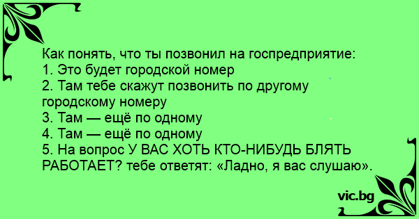 5. На вопрос У ВАС ХОТЬ КТО-НИБУДЬ БЛЯTЬ РАБОТАЕТ? тебе ответят: «Ладно, я вас слушаю».