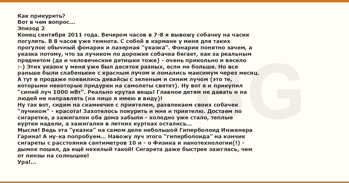 Как прикурить? Вот в чем вопрос... Эпизод 2 Конец сентября 2011 года. Вечером часов в 7-8 я вывожу собачку на часик погулять. В 8 часов уже темнота. С собой в кармане у меня для таких прогулок обычный фонарик и лазерная "указка". Фонарик понятно зачем, а указка потому, что за лучиком по дорожке собачка бегает, как за реальным предметом (да и человеческие детишки тоже) - очень прикольно и весело :-) Этих указок у меня уже был десяток разных, если не больше. Но все раньше были слабенькие с красным лучом и ломались максимум через месяц. А тут в продаже появились девайсы с зеленым и синим лучом (это те, которыми некоторые придурки на самолеты светят). Ну вот я и прикупил "синий луч 1000 мВт". Реально крутая вещь! Главное детям не давать и на людей не направлять (на лицо я имею в виду)! Ну так вот, сидим на скамеечке с приятелем, развлекаем своих собачек "лучиком" - красота! Захотелось покурить и мне и приятелю. Достаем по сигаретке, а зажигалки оба дома забыли - холодно уже стало, теплые куртки надели, а зажигалки в летних куртках остались... Мысля! Ведь эта "указка" на самом деле небольшой Гиперболоид Инженера Гарина! А ну-ка попробуем... Навожу луч этого "гиперболоида" на кончик сигареты с расстояния сантиметров 10 и - о Физика и нанотехнологии(!) - дымок пошел, да ещё нехилый такой! Сигарета даже быстрее зажглась, чем от линзы на солнышке! Ура! А потом мы решили немножко похулиганить и попугать "гиперболоидом" ворон, сидящих на крышах 17-этажных домов. Прикольно было - человек 10 собралось посмотреть на эту "охоту". Попробуйте, вам понравится :-) PS. Ещё раз хочу предупредить, что с такими девайсами нужно обращаться очень аккуратно, чтобы не нанести вред здоровью. PPS. Звездной ночью такие девайсы с зеленым или синим лучом можно использовать в качестве указок: вот тебе Полярная звезда, вот тебе Кассиопея и т. д. Как в планетарии. Чудо! Но только в самолет не попадите :-)