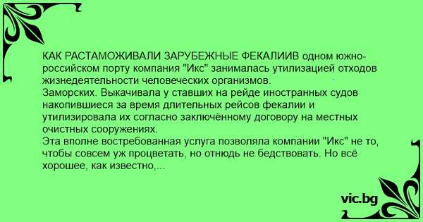 КАК РАСТАМОЖИВАЛИ ЗАРУБЕЖНЫЕ ФЕКАЛИИВ одном южно-российском порту компания "Икс" занималась утилизацией отходов жизнедеятельности человеческих организмов. Заморских. Выкачивала у ставших на рейде иностранных судов накопившиеся за время длительных рейсов фекалии и утилизировала их согласно заключённому договору на местных очистных сооружениях. Эта вполне востребованная услуга позволяла компании "Икс" не то, чтобы совсем уж процветать, но отнюдь не бедствовать. Но всё хорошее, как известно, когда-то заканчивается. В один прекрасный день к "иксам" пришёл представитель таможни и заявил, что поскольку фекалии они берут у иностранцев и ввозят к нам, то это самый что ни на есть "серый" импорт. Надо платить ввозную пошлину, иначе за державу обидно. Так что, приводите, мол, документы в порядок, а пока постоит ваш говновоз опечатанным. Юристы "иксов" собрали совет и пришли к заключению, что у них есть два варианта решения неожиданно возникшей проблемы. Или сунуть на лапу таможне и тем самым обречь себя на постоянную дань впоследствии. Или обратиться в суд и выиграть дело. Но месяца через три, а то и через полгода. А на какие шиши всё это время жить и выполнять ранее заключённые договора по обслуживанию иностранных кораблей? Юристы пригорюнились. Пришли к таможенному начальству на поклон. Загнали цистерну на таможенный склад, намекнув, что уже завтра "порешают вопросы". И таки порешали! На следующий день таможенники получили официальное письмо, коим компания "Икс" уведомляла их, что... отказывается от своего груза в пользу государства. Говорят, цистерна с импортными фекалиями уже неделю стоит на таможенном складе одного из портов нашего благословенного юга. Таможенники нервничают: через магазин "Конфискат" добычу не реализуешь. И выбросить нельзя - груз-то теперь государственный! И как объяснить державе, откуда у неё партия такого "золота" образовалась? А компания "Икс" установила на свой катерок новую цистерну и дальше работает.