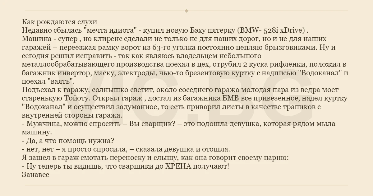 Как рождаются слухи Недавно сбылась "мечта идиота" - купил новую Бэху пятерку (BMW- 528i xDrive) . Машина - супер , но клиренс сделали не только не для наших дорог, но и не для наших гаражей – переезжая рамку ворот из 63-го уголка постоянно цепляю брызговиками. Ну и сегодня решил исправить - так как являюсь владельцем небольшого металлообрабатывающего производства поехал в цех, отрубил 2 куска рифленки, положил в багажник инвертор, маску, электроды, чью-то брезентовую куртку с надписью "Водоканал" и поехал "ваять". Подъехал к гаражу, солнышко светит, около соседнего гаража молодая пара из ведра моет старенькую Тойоту. Открыл гараж , достал из багажника БМВ все привезенное, надел куртку "Водоканал" и осуществил задуманное, то есть приварил листы в качестве трапиков с внутренней стороны гаража. - Мужчина, можно спросить – Вы сварщик? – это подошла девушка, которая рядом мыла машину. - Да, а что помощь нужна? - нет, нет – я просто спросила, – сказала девушка и отошла. Я зашел в гараж смотать переноску и слышу, как она говорит своему парню: - Ну теперь ты видишь, что сварщики до ХPEHA получают! Занавес
