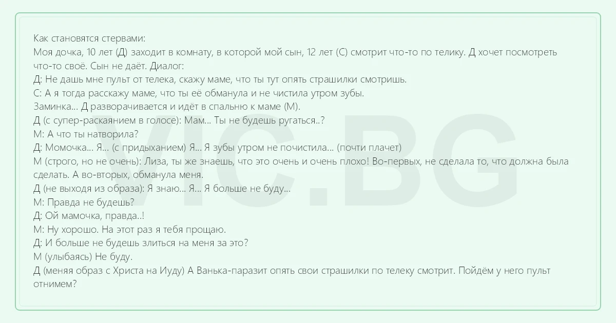 Как становятся стервами: Моя дочка, 10 лет (Д) заходит в комнату, в которой мой сын, 12 лет (С) смотрит что-то по телику. Д хочет посмотреть что-то своё. Сын не даёт. Диалог: Д: Не дашь мне пульт от телека, скажу маме, что ты тут опять страшилки смотришь. С: А я тогда расскажу маме, что ты её обманула и не чистила утром зубы. Заминка... Д разворачивается и идёт в спальню к маме (М). Д (с супер-раскаянием в голосе): Мам... Ты не будешь ругаться..? М: А что ты натворила? Д: Момочка... Я... (с придыханием) Я... Я зубы утром не почистила... (почти плачет) М (строго, но не очень): Лиза, ты же знаешь, что это очень и очень плохо! Во-первых, не сделала то, что должна была сделать. А во-вторых, обманула меня. Д (не выходя из образа): Я знаю... Я... Я больше не буду... М: Правда не будешь? Д: Ой мамочка, правда..! М: Ну хорошо. На этот раз я тебя прощаю. Д: И больше не будешь злиться на меня за это? М (улыбаясь) Не буду. Д (меняя образ с Христа на Иуду) А Ванька-паразит опять свои страшилки по телеку смотрит. Пойдём у него пульт отнимем?