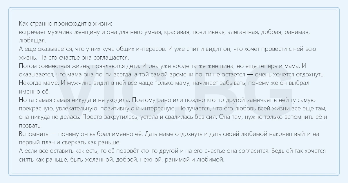 Как странно происходит в жизни: встречает мужчина женщину и она для него умная, красивая, позитивная, элегантная, добрая, ранимая, любящая. А еще оказывается, что у них куча общих интересов. И уже спит и видит он, что хочет провести с ней всю жизнь. На его счастье она соглашается. Потом совместная жизнь, появляются дети. И она уже вроде та же женщина, но еще теперь и мама. И оказывается, что мама она почти всегда, а той самой времени почти не остается — очень хочется отдохнуть. Некогда маме. И мужчина видит в ней все чаще только маму, начинает забывать, почему же он выбрал именно её. Но та самая самая никуда и не уходила. Поэтому рано или поздно кто-то другой замечает в ней ту самую прекрасную, увлекательную, позитивную и интересную. Получается, что его любовь всей жизни все еще там, она никуда не делась. Просто закрутилась, устала и свалилась без сил. Она там, нужно только вспомнить её и позвать. Вспомнить — почему он выбрал именно её. Дать маме отдохнуть и дать своей любимой наконец выйти на первый план и сверкать как раньше. А если все оставить как есть, то её позовёт кто-то другой и на его счастье она согласится. Ведь ей так хочется сиять как раньше, быть желанной, доброй, нежной, ранимой и любимой.
