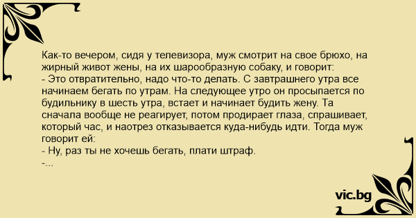- Это отвратительно, надо что-то делать. С завтрашнего утра все начинаем бегать по утрам. На следующее утро он просыпается по будильнику в шесть утра, встает и начинает будить жену. Та сначала вообще не реагирует, потом продирает глаза, спрашивает, который час, и наотрез отказывается куда-нибудь идти. Тогда муж говорит ей:
