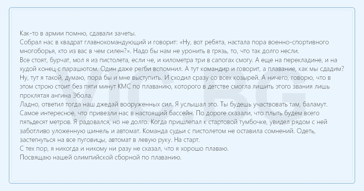 Как-то в армии помню, сдавали зачеты. Собрал нас в квадрат главнокомандующий и говорит: «Ну, вот ребята, настала пора военно-спортивного многоборья, кто из вас в чем силен?». Надо бы нам не уронить в грязь, то, что так долго несли. Все стоят, бурчат, мол я из пистолета, если че, и километра три в сапогах смогу. А еще на перекладине, и на худой конец с парашютом. Один даже регби вспомнил. А тут командир и говорит, а плавание, как мы сдадим? Ну, тут я такой, думаю, пора бы и мне выступить. И сходил сразу со всех козырей. А ничего, говорю, что в этом строю стоит без пяти минут КМС по плаванию, которого в детстве смогла лишить этого звания лишь проклятая ангина Эбола. Ладно, ответил тогда наш джедай вооруженных сил. Я услышал это. Ты будешь участвовать там, баламут. Самое интересное, что привезли нас в настоящий бассейн. По дороге сказали, что плыть будем всего пятьдесят метров. Я радовался, но не долго. Когда пришлепал к стартовой тумбочке, увидел рядом с ней заботливо уложенную шинель и автомат. Команда судьи с пистолетом не оставила сомнений. Одеть, застегнуться на все пуговицы, автомат в левую руку. На старт. С тех пор, я никогда и никому ни разу не сказал, что я хорошо плаваю. Посвящаю нашей олимпийской сборной по плаванию.