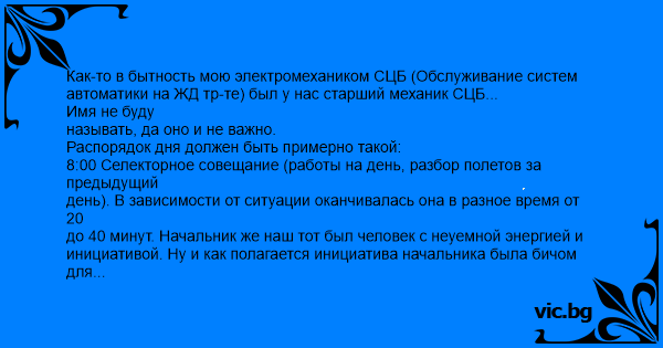 Как-то в бытность мою электромехаником СЦБ (Обслуживание систем автоматики на ЖД тр-те) был у нас старший механик СЦБ...