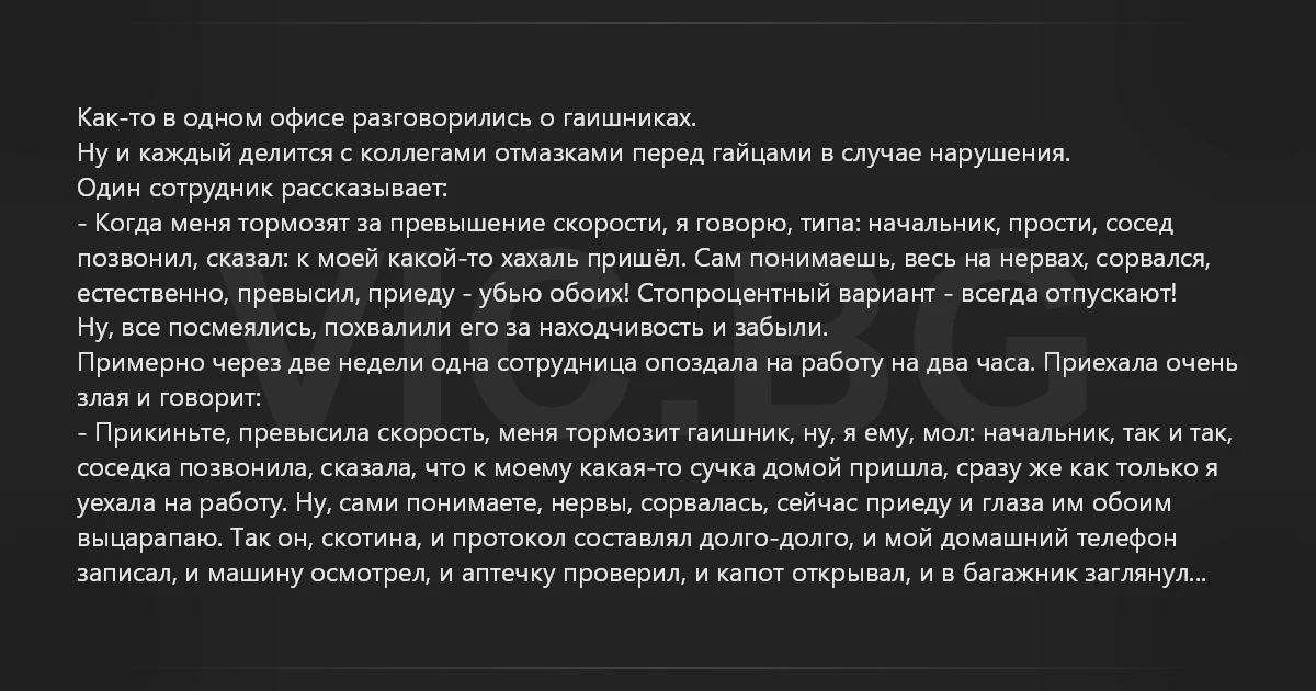 Как-то в одном офисе разговорились о гаишниках. Ну и каждый делится с коллегами отмазками перед гайцами в случае нарушения. Один сотрудник рассказывает: - Когда меня тормозят за превышение скорости, я говорю, типа: начальник, прости, сосед позвонил, сказал: к моей какой-то хахаль пришёл. Сам понимаешь, весь на нервах, сорвался, естественно, превысил, приеду - убью обоих! Стопроцентный вариант - всегда отпускают! Ну, все посмеялись, похвалили его за находчивость и забыли. Примерно через две недели одна сотрудница опоздала на работу на два часа. Приехала очень злая и говорит: - Прикиньте, превысила скорость, меня тормозит гаишник, ну, я ему, мол: начальник, так и так, соседка позвонила, сказала, что к моему какая-то сучка домой пришла, сразу же как только я уехала на работу. Ну, сами понимаете, нервы, сорвалась, сейчас приеду и глаза им обоим выцарапаю. Так он, скотина, и протокол составлял долго-долго, и мой домашний телефон записал, и машину осмотрел, и аптечку проверил, и капот открывал, и в багажник заглянул...