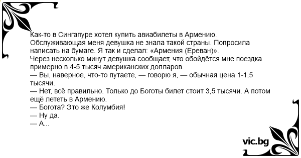 Как-то в Сингапуре хотел купить авиабилеты в Армению. Обслуживающая меня девушка не знала такой страны. Попросила написать на бумаге. Я так и сделал: «Армения (Ереван)». Через несколько минут девушка сообщает, что обойдётся мне поездка примерно в 4-5 тысяч американских долларов. — Вы, наверное, что-то путаете, — говорю я, — обычная цена 1-1,5 тысячи. — Нет, всё правильно. Только до Боготы билет стоит 3,5 тысячи. А потом ещё лететь в Армению. — Богота? Это же Колумбия! — Ну да. — А зачем мне Колумбия? — Извините, но все рейсы в Армению — только через Боготу. — Девушка, вы когда-нибудь карту видели? Колумбия — это Южная Америка, а мне надо в Армению. — Я вас понимаю, но без Боготы никак нельзя. Я не знал, смеяться мне или плакать. Мы в недоумении смотрели друг на друга. И тут до меня дошло. Я вспомнил, что в Колумбии есть маленький город Армения. Всё мигом прояснилось.
