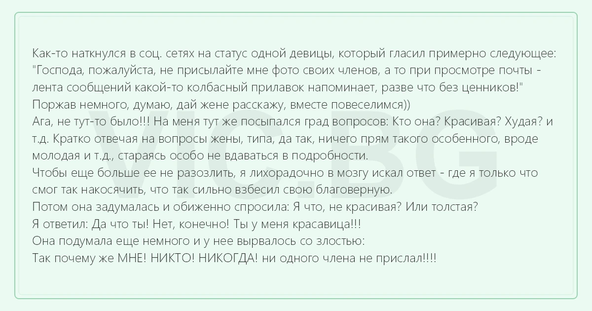 Как-то наткнулся в соц. сетях на статус одной девицы, который гласил примерно следующее: "Господа, пожалуйста, не присылайте мне фото своих членов, а то при просмотре почты - лента сообщений какой-то колбасный прилавок напоминает, разве что без ценников!" Поржав немного, думаю, дай жене расскажу, вместе повеселимся)) Ага, не тут-то было!!! На меня тут же посыпался град вопросов: Кто она? Красивая? Худая? и т.д. Кратко отвечая на вопросы жены, типа, да так, ничего прям такого особенного, вроде молодая и т.д., стараясь особо не вдаваться в подробности. Чтобы еще больше ее не разозлить, я лихорадочно в мозгу искал ответ - где я только что смог так накосячить, что так сильно взбесил свою благоверную. Потом она задумалась и обиженно спросила: Я что, не красивая? Или толстая? Я ответил: Да что ты! Нет, конечно! Ты у меня красавица!!! Она подумала еще немного и у нее вырвалось со злостью: Так почему же МНЕ! НИКТО! НИКОГДА! ни одного члeнa не прислал!!!!