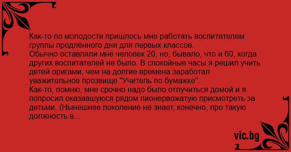 Обычно оставляли мне человек 20, но, бывало, что и 60, когда других воспитателей не было. В спокойные часы я решил учить детей оригами, чем на долгие времена заработал уважительное прозвище "Учитель по бумажке".