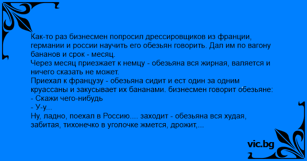 Как-то раз бизнесмен попросил дрессировщиков из франции, германии и россии научить его обезьян говорить. Дал им по вагону бананов и срок - месяц.