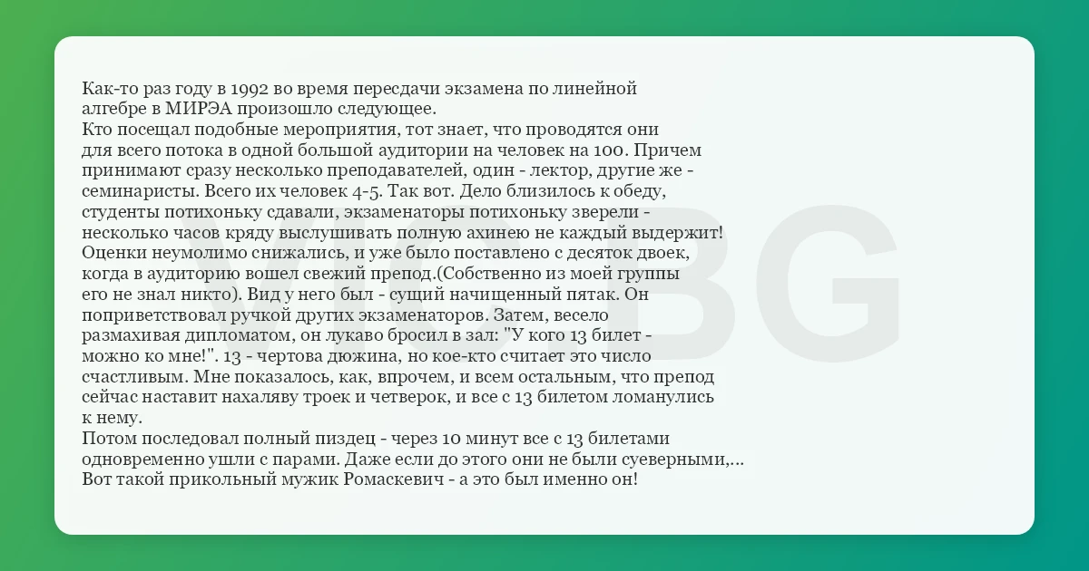 Как-то раз году в 1992 во время пересдачи экзамена по линейной
