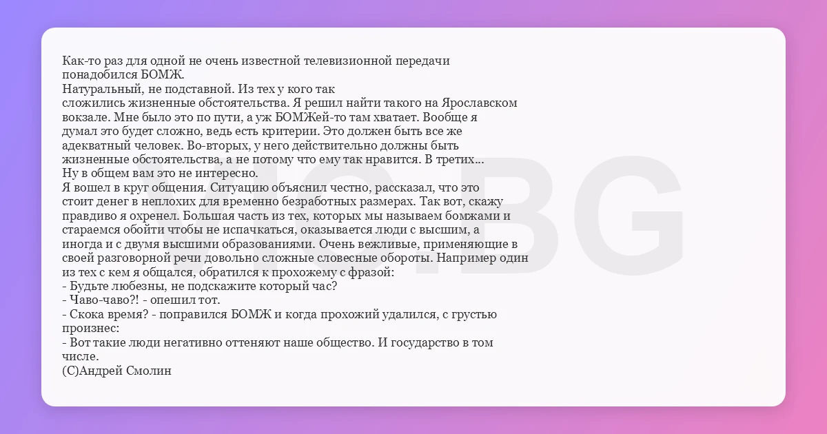 Как-то раз для одной не очень известной телевизионной передачи понадобился БОМЖ. Натуральный, не подставной. Из тех у кого так сложились жизненные обстоятельства. Я решил найти такого на Ярославском вокзале. Мне было это по пути, а уж БОМЖей-то там хватает. Вообще я думал это будет сложно, ведь есть критерии. Это должен быть все же адекватный человек. Во-вторых, у него действительно должны быть жизненные обстоятельства, а не потому что ему так нравится. В третих... Ну в общем вам это не интересно. Я вошел в круг общения. Ситуацию объяснил честно, рассказал, что это стоит денег в неплохих для временно безработных размерах. Так вот, скажу правдиво я охренел. Большая часть из тех, которых мы называем бомжами и стараемся обойти чтобы не испачкаться, оказывается люди с высшим, а иногда и с двумя высшими образованиями. Очень вежливые, применяющие в своей разговорной речи довольно сложные словесные обороты. Например один из тех с кем я общался, обратился к прохожему с фразой: - Будьте любезны, не подскажите который час? - Чаво-чаво?! - опешил тот. - Скока время? - поправился БОМЖ и когда прохожий удалился, с грустью произнес: - Вот такие люди негативно оттеняют наше общество. И государство в том числе. (C)Андрей Смолин
