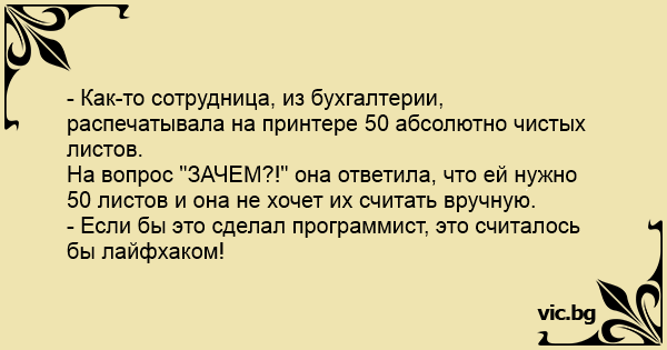 - Как-то сотрудница, из бухгалтерии, распечатывала на принтере 50 абсолютно чистых листов.