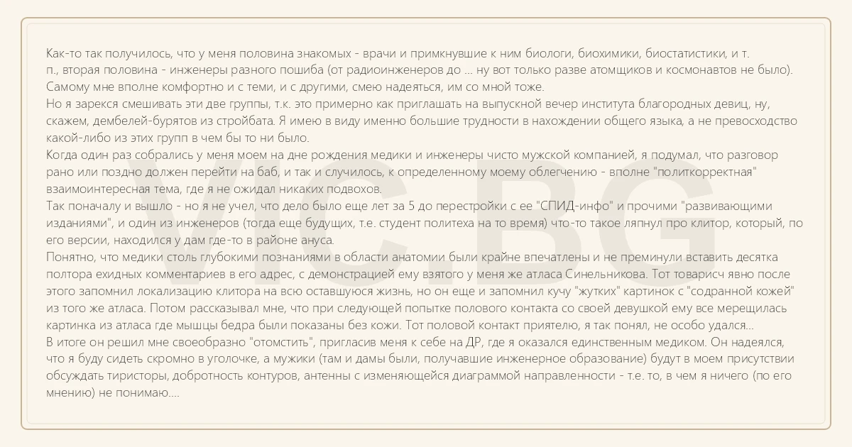 Как-то так получилось, что у меня половина знакомых - врачи и примкнувшие к ним биологи, биохимики, биостатистики, и т. п., вторая половина - инженеры разного пошиба (от радиоинженеров до ... ну вот только разве атомщиков и космонавтов не было). Самому мне вполне комфортно и с теми, и с другими, смею надеяться, им со мной тоже. Но я зарекся смешивать эти две группы, т.к. это примерно как приглашать на выпускной вечер института благородных девиц, ну, скажем, дембелей-бурятов из стройбата. Я имею в виду именно большие трудности в нахождении общего языка, а не превосходство какой-либо из этих групп в чем бы то ни было. Когда один раз собрались у меня моем на дне рождения медики и инженеры чисто мужской компанией, я подумал, что разговор рано или поздно должен перейти на баб, и так и случилось, к определенному моему облегчению - вполне "политкорректная" взаимоинтересная тема, где я не ожидал никаких подвохов. Так поначалу и вышло - но я не учел, что дело было еще лет за 5 до перестройки с ее "СПИД-инфо" и прочими "развивающими изданиями", и один из инженеров (тогда еще будущих, т.е. студент политеха на то время) что-то такое ляпнул про клитор, который, по его версии, находился у дам где-то в районе ануса. Понятно, что медики столь глубокими познаниями в области анатомии были крайне впечатлены и не преминули вставить десятка полтора ехидных комментариев в его адрес, с демонстрацией ему взятого у меня же атласа Синельникова. Тот товарисч явно после этого запомнил локализацию клитора на всю оставшуюся жизнь, но он еще и запомнил кучу "жутких" картинок с "содранной кожей" из того же атласа. Потом рассказывал мне, что при следующей попытке полового контакта со своей девушкой ему все мерещилась картинка из атласа где мышцы бедра были показаны без кожи. Тот половой контакт приятелю, я так понял, не особо удался... В итоге он решил мне своеобразно "отомстить", пригласив меня к себе на ДР, где я оказался единственным медиком. Он надеялся, что я буду сидеть скромно в уголочке, а мужики (там и дамы были, получавшие инженерное образование) будут в моем присутствии обсуждать тиристоры, добротность контуров, антенны с изменяющейся диаграммой направленности - т.е. то, в чем я ничего (по его мнению) не понимаю. Ха! Эти радиоинженеры выстроились ко мне в очередь для обсуждения своих проблем со здоровьем, т.к. тиристоры они друг с другом обсуждали неоднократно по много раз на дню, а "с медиком удается поговорить не каждый день", как сказала мне на том ДР какая-то симпатичная студентка радиофака...